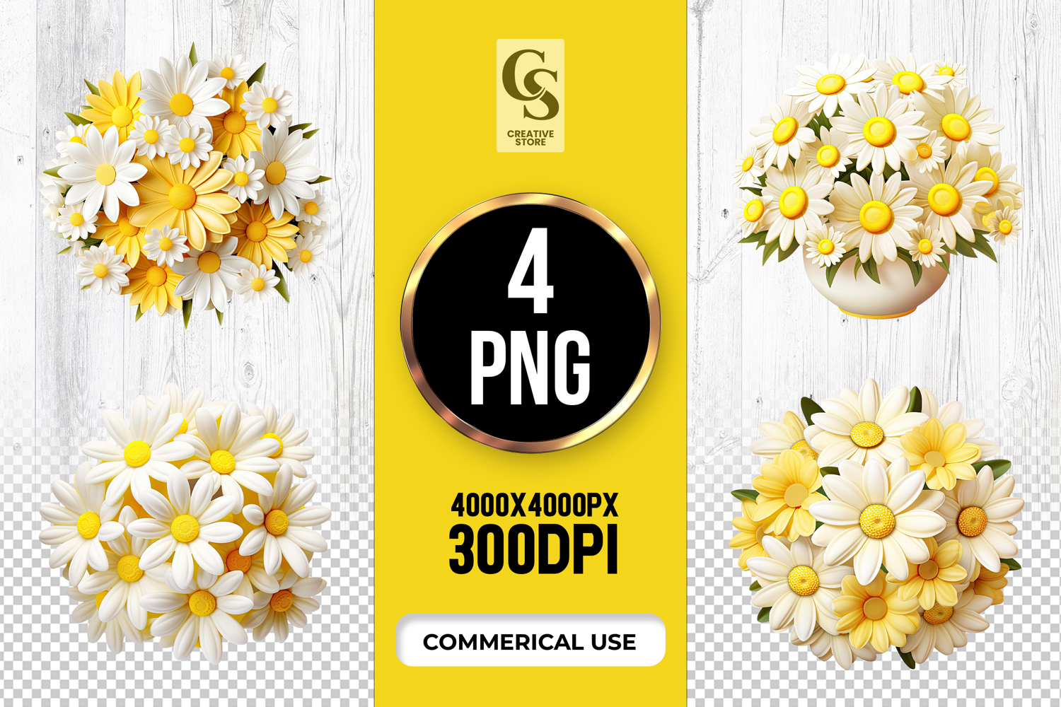 4 Yellow and White Daisy Flower Clipart Sublimation PNG Files Perfect for Greeting Cards, Invitations, Junk Journal, Party Decor, Scrapbooking and many other craft projects.