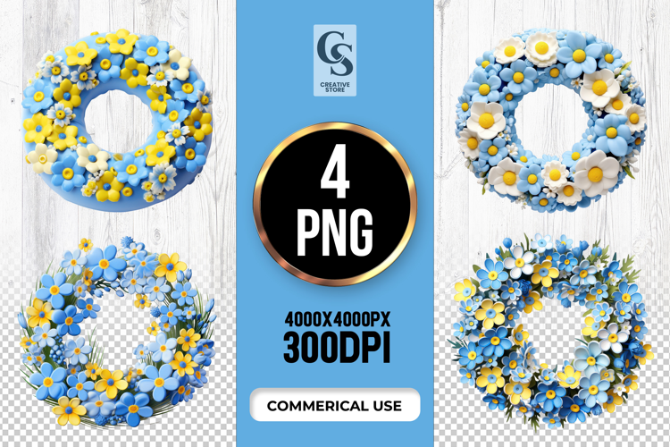 4 Blue and Yellow Floral Wreath Clipart Sublimation PNG Files Perfect for Greeting Cards, Invitations, Junk Journal, Party Decor, Scrapbooking and many other craft projects.