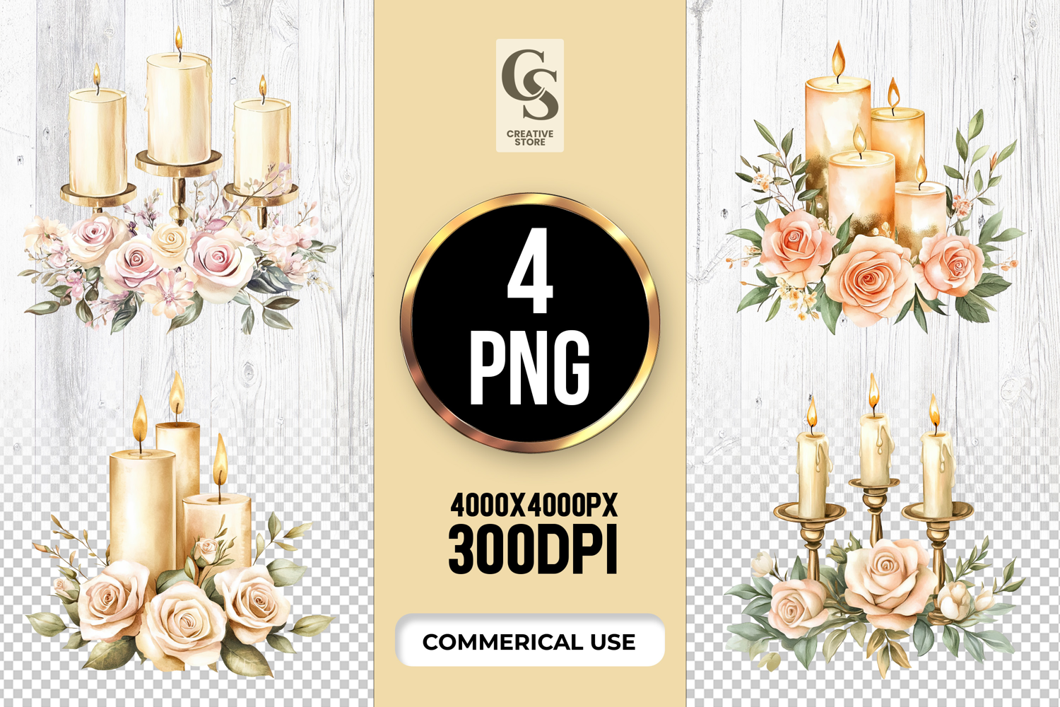 4 Candle Rose Floral Clipart Sublimation PNG Files Perfect for Greeting Cards, Invitations, Junk Journal, Party Decor, Scrapbooking and many other craft projects.
