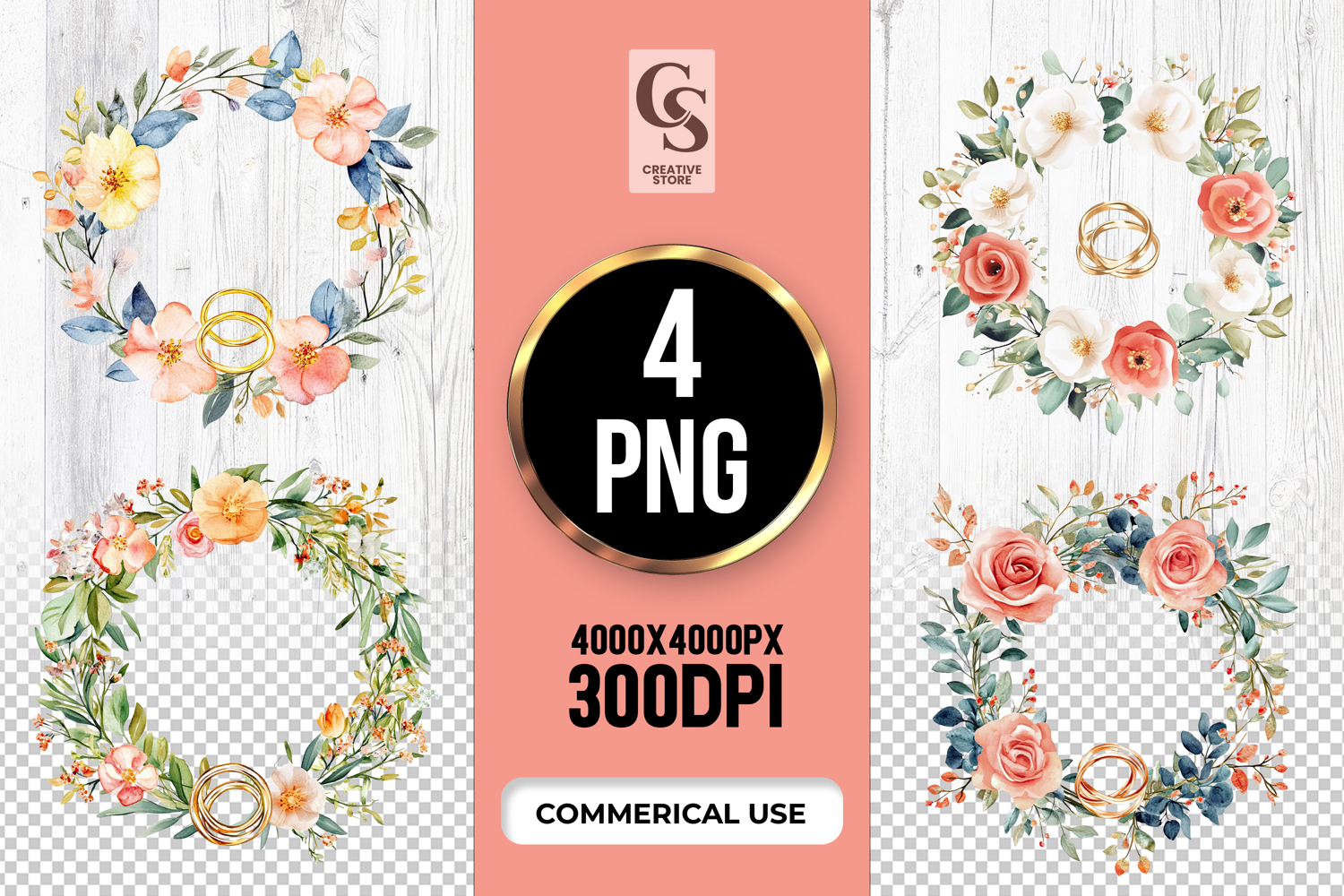 4 Wedding Floral Wreath Clipart Sublimation PNG Files Perfect for Greeting Cards, Invitations, Junk Journal, Party Decor, Scrapbooking and many other craft projects.