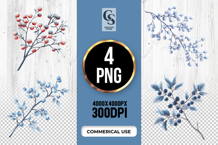 4 Winter Berry Branch Clipart Sublimation PNG Files Perfect for Greeting Cards, Invitations, Junk Journal, Party Decor, Scrapbooking and many other craft projects.