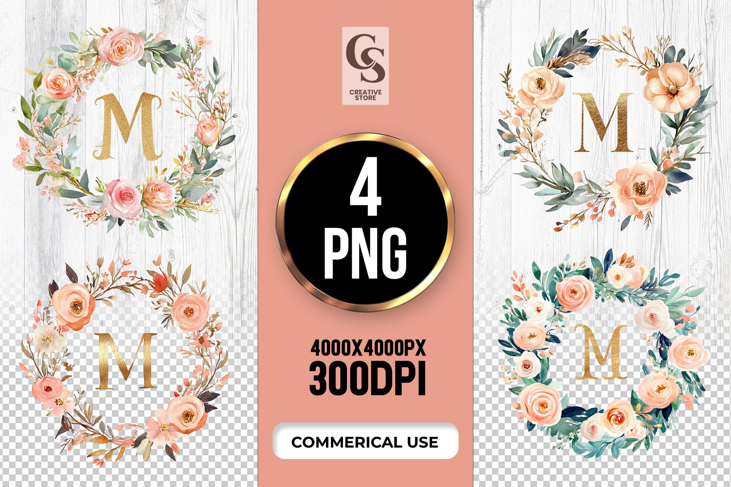 4 Floral Monogram Wreath Clipart Sublimation PNG Files Perfect for Greeting Cards, Invitations, Junk Journal, Party Decor, Scrapbooking and many other craft projects.