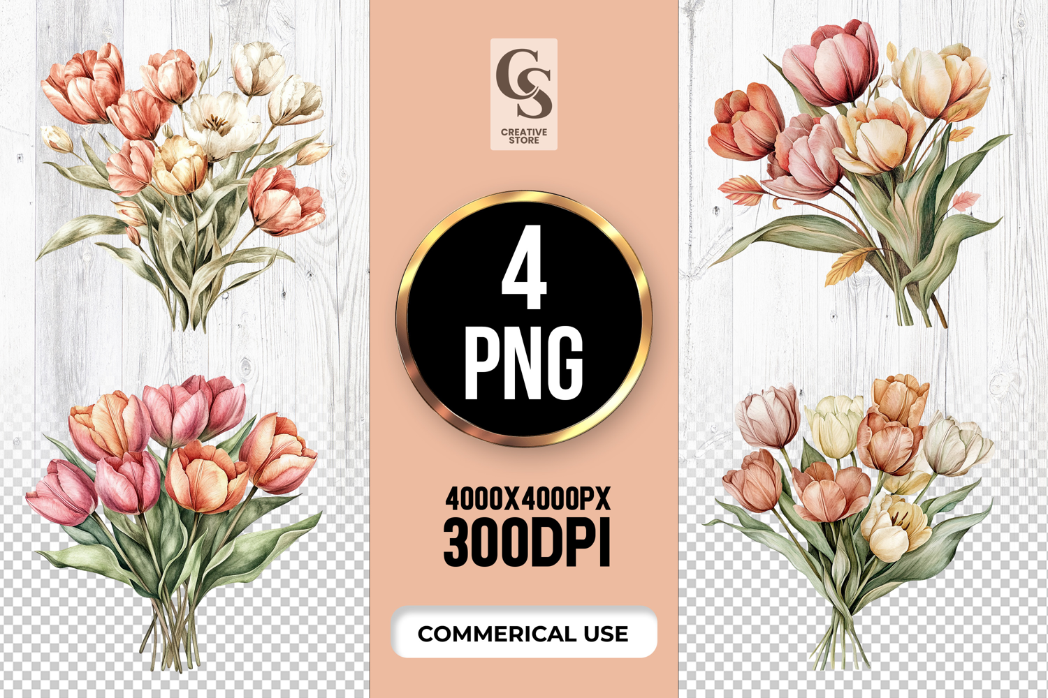 4 Vintage Tulip Bouquet Clipart Sublimation PNG Files Perfect for Greeting Cards, Invitations, Junk Journal, Party Decor, Scrapbooking and many other craft projects.