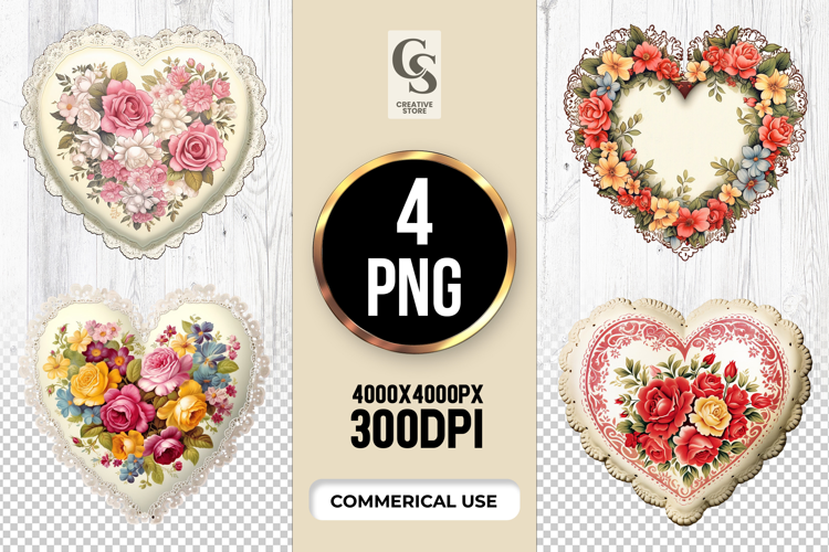 4 Vintage Floral Heart with Roses Clipart Sublimation PNG Files Perfect for Greeting Cards, Invitations, Junk Journal, Party Decor, Scrapbooking and many other craft projects.