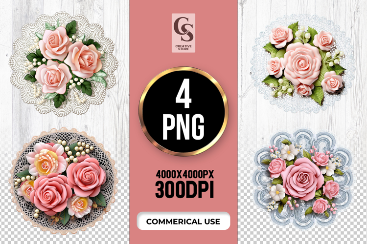 4 Elegant Lace Floral Rose Clipart Sublimation PNG Files Perfect for Greeting Cards, Invitations, Junk Journal, Party Decor, Scrapbooking and many other craft projects.