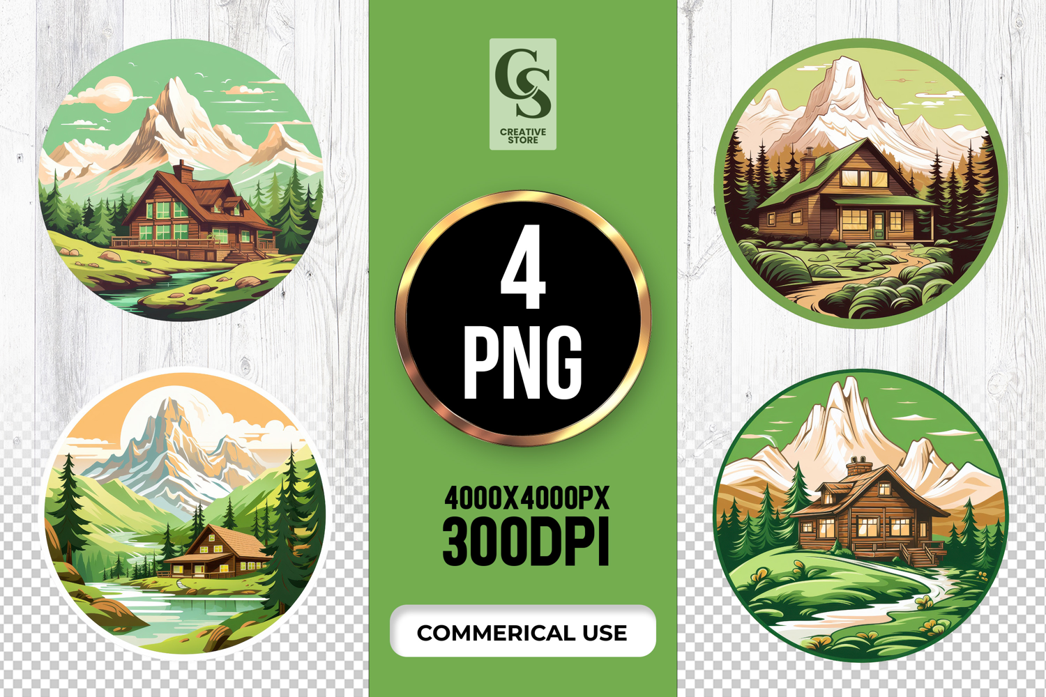 4 Mountain Cabin Clipart Sublimation PNG Files Perfect for Greeting Cards, Invitations, Junk Journal, Party Decor, Scrapbooking and many other craft projects.