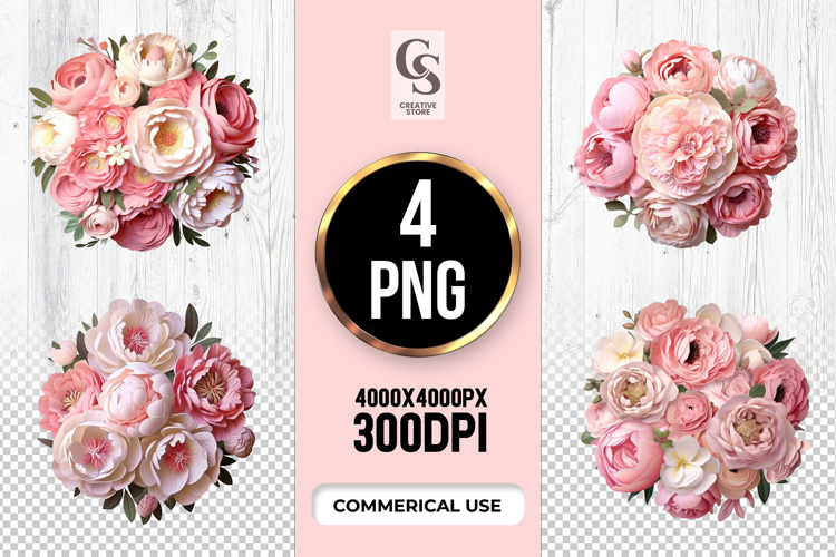 4 Pink Floral Bouquet Clipart Sublimation PNG Files Perfect for Greeting Cards, Invitations, Junk Journal, Party Decor, Scrapbooking and many other craft projects.