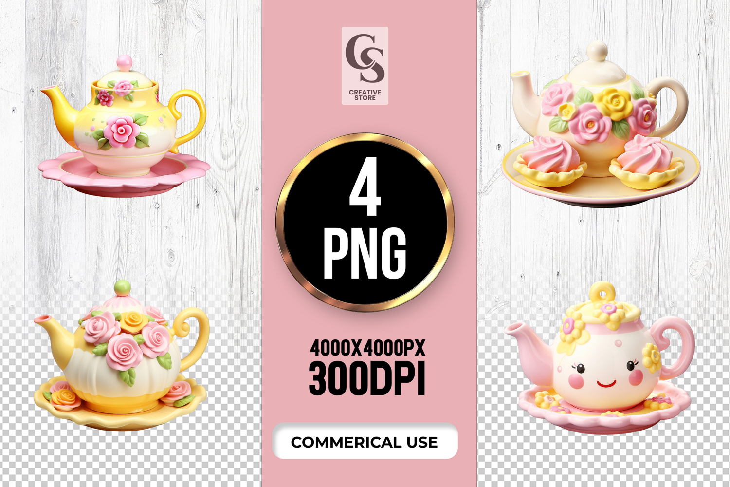 4 Floral Teapot and Cup Set Clipart PNG Sublimationn Files Perfect for Greeting Cards, Invitations, Junk Journal, Party Decor, Scrapbooking and many other craft projects.