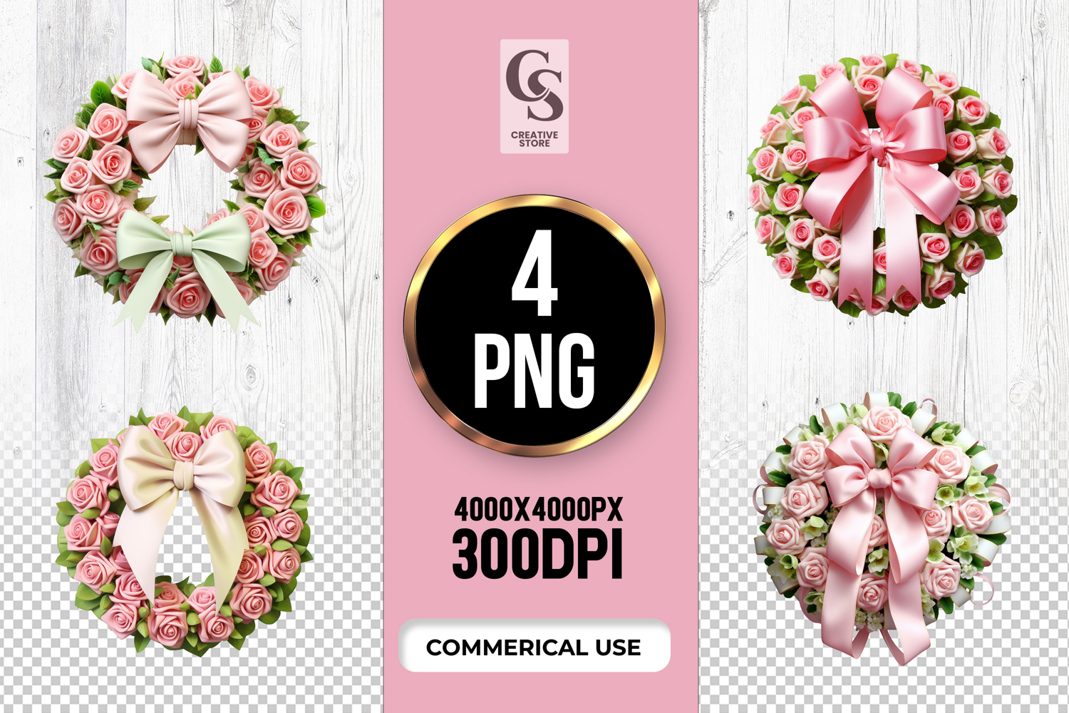 4 Pink Rose Wreath With Ribbons Clipart PNG Files Perfect for Greeting Cards, Invitations, Junk Journal, Party Decor, Scrapbooking and many other craft projects.