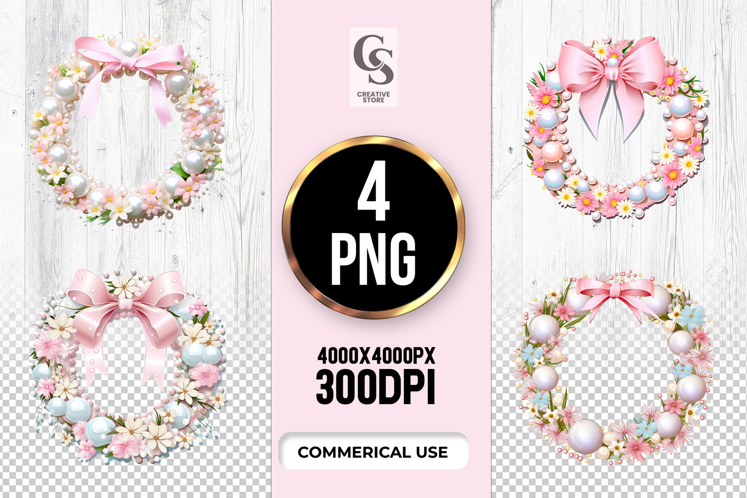 4 Floral Pearl Wreath Clipart Sublimation PNG Files Perfect for Greeting Cards, Invitations, Junk Journal, Party Decor, Scrapbooking and many other craft projects.