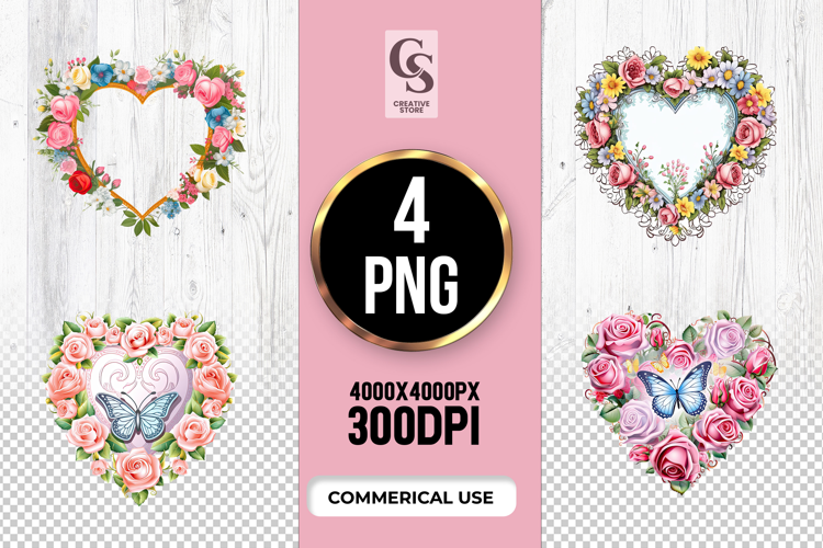 4 Floral Heart Frame Clipart Sublimation PNG Files Perfect for Greeting Cards, Invitations, Junk Journal, Party Decor, Scrapbooking and many other craft projects.