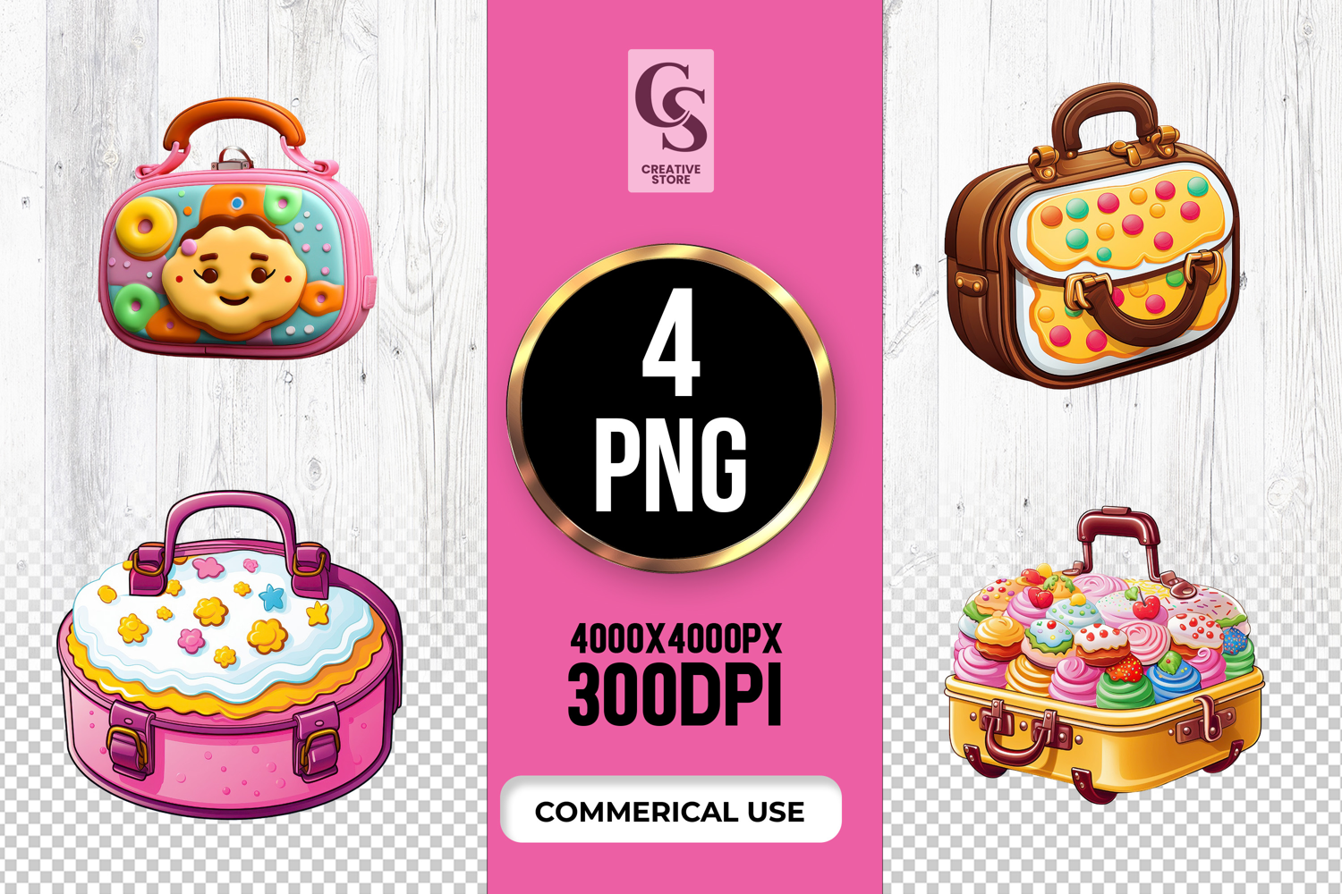 4 Cute Dessert Suitcase Clipart Sublimation PNG Files Perfect for Greeting Cards, Invitations, Junk Journal, Party Decor, Scrapbooking and many other craft projects.