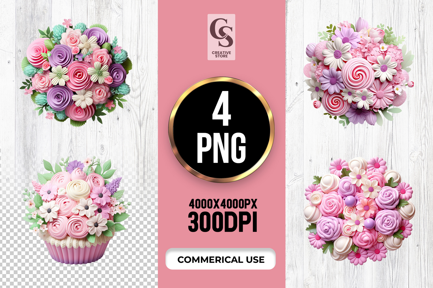 4 Cute Floral Cupcake Bouquet Clipart Sublimation PNG Files Perfect for Greeting Cards, Invitations, Junk Journal, Party Decor, Scrapbooking and many other craft projects.