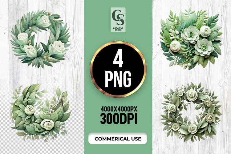 4 Green Leaf Floral Wreath Clipart Sublimation PNG Files Perfect for Greeting Cards, Invitations, Junk Journal, Party Decor, Scrapbooking and many other craft projects.