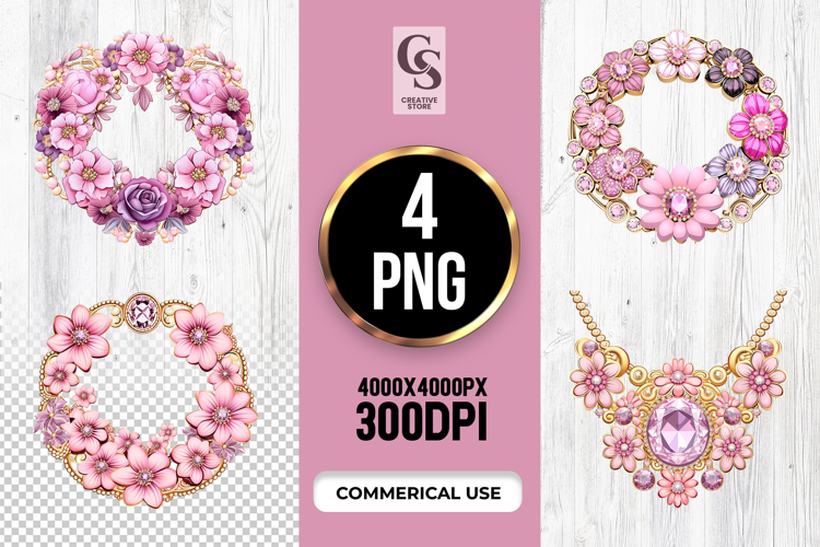 4 Pink Floral Jewelry Wreath Clipart Sublimation PNG Files Perfect for Greeting Cards, Invitations, Junk Journal, Party Decor, Scrapbooking and many other craft projects.