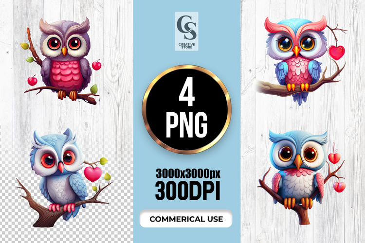 4 Cute Owl With Heart Clipart Sublimation PNG Files Perfect for Greeting Cards, Invitations, Junk Journal, Party Decor, Scrapbooking and many other craft projects.