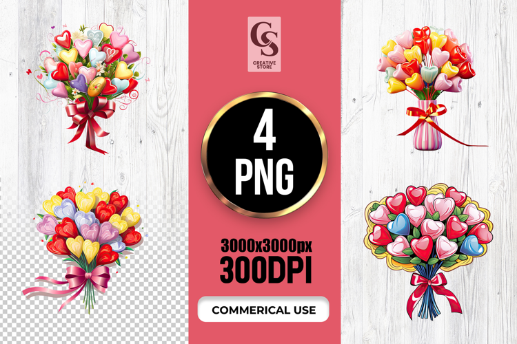 4 Heart Shaped Flower Bouquet Clipart PNG Files Perfect for Greeting Cards, Invitations, Junk Journal, Party Decor, Scrapbooking and many other craft projects.