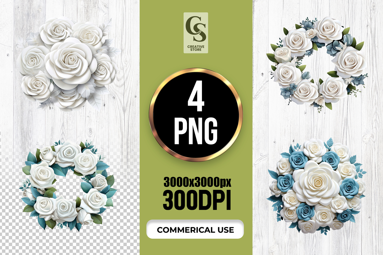 4 White Rose Floral Wreath PNG Files Perfect for Greeting Cards, Invitations, Junk Journal, Party Decor, Scrapbooking and many other craft projects.