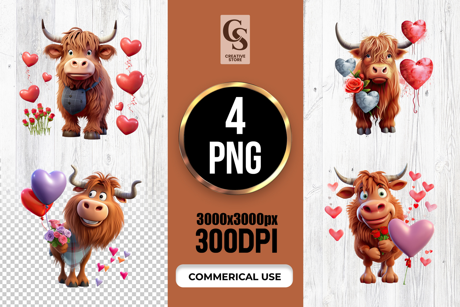 4 Highland Cow Valentine Hearts Cute Illustration PNG Files Perfect for Greeting Cards, Invitations, Junk Journal, Party Decor, Scrapbooking and many other craft projects.