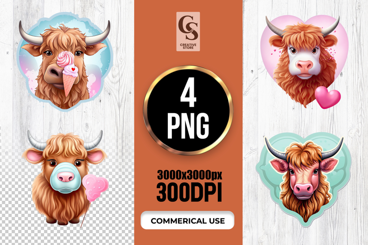 4 Cute Highland Cow Valentine Ice Cream PNG Files Perfect for Greeting Cards, Invitations, Junk Journal, Party Decor, Scrapbooking and many other craft projects.