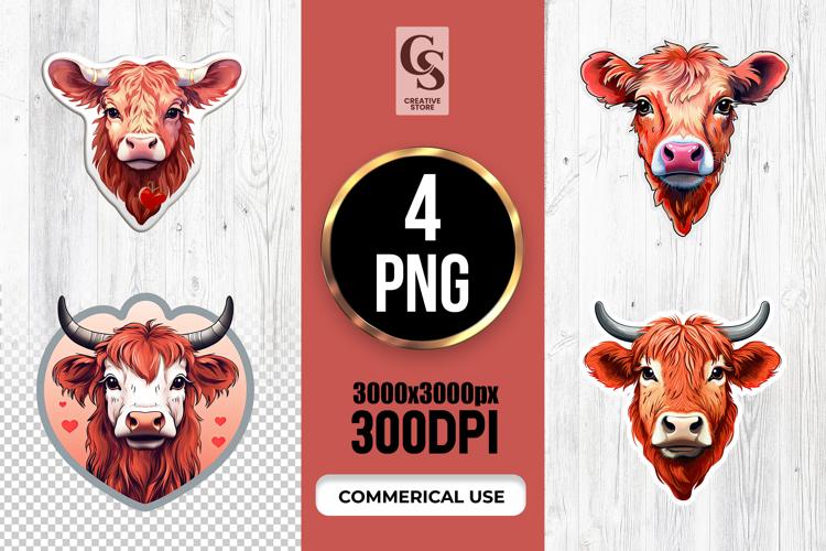 4 Cute Highland Cow Face Valentine Sticker SVG PNG Files Perfect for Greeting Cards, Invitations, Junk Journal, Party Decor, Scrapbooking and many other craft projects.