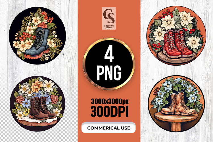 4 Floral Boots Vintage Illustration Sublimation SVG PNG Files Perfect for Greeting Cards, Invitations, Junk Journal, Party Decor, Scrapbooking and many other craft projects.