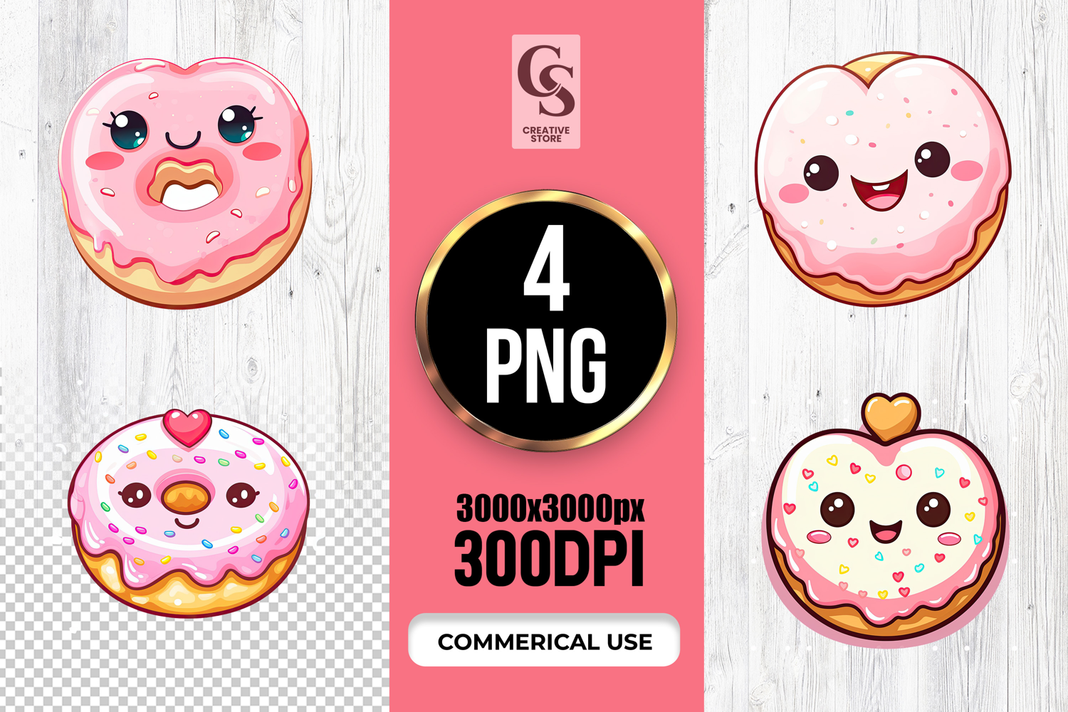 4 Cute Kawaii Donut Clipart Sublimation PNG Files Perfect for Greeting Cards, Invitations, Junk Journal, Party Decor, Scrapbooking and many other craft projects.