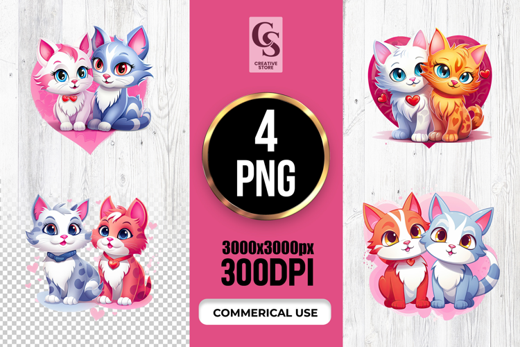 4Cute Cat Couple Love Clipart Sublimation PNG Files Perfect for Greeting Cards, Invitations, Junk Journal, Party Decor, Scrapbooking and many other craft projects.