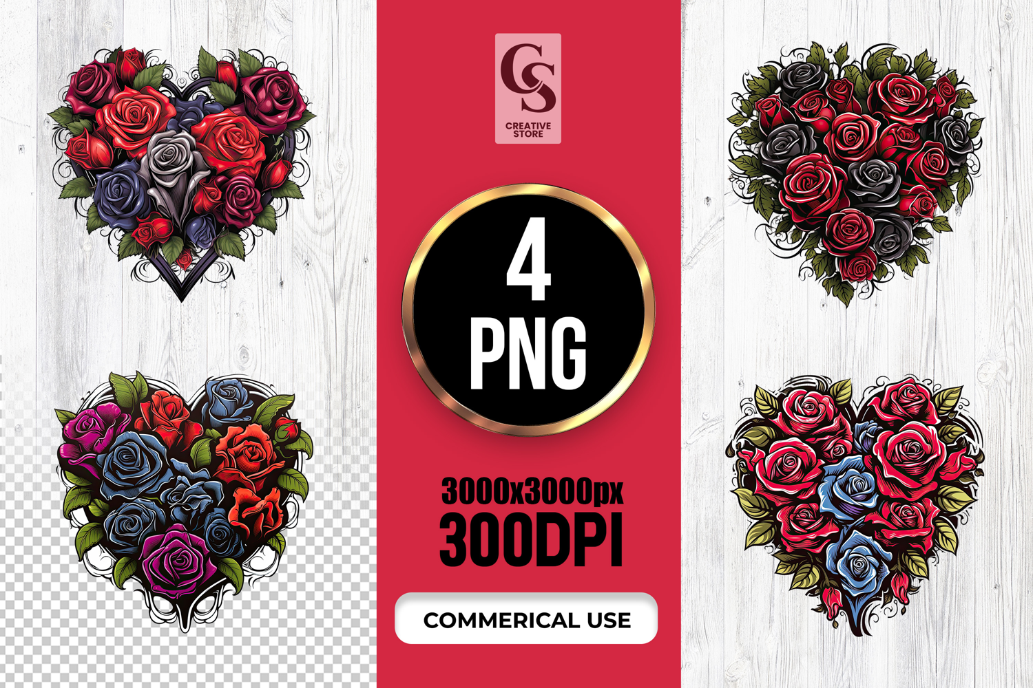 4 Vintage Rose Heart Floral Clipart Sublimation PNG Files Perfect for Greeting Cards, Invitations, Junk Journal, Party Decor, Scrapbooking and many other craft projects.