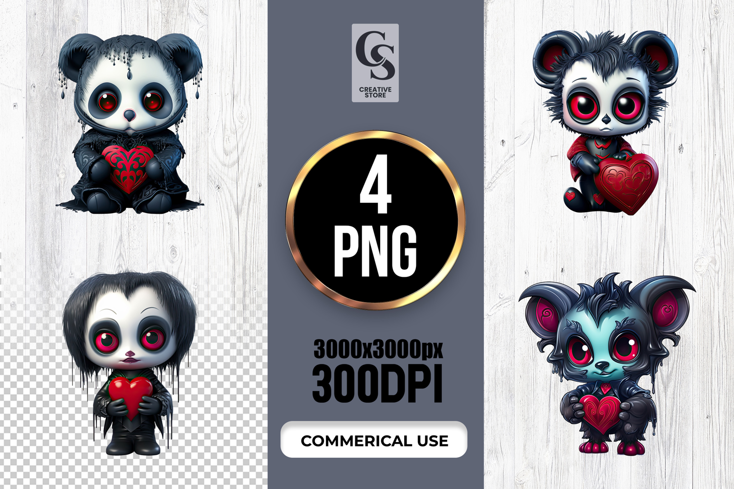 4 Gothic Cute Panda Holding Heart Clipart Sublimation PNG Files Perfect for Greeting Cards, Invitations, Junk Journal, Party Decor, Scrapbooking and many other craft projects.