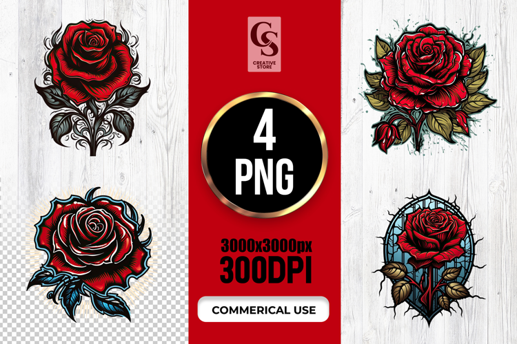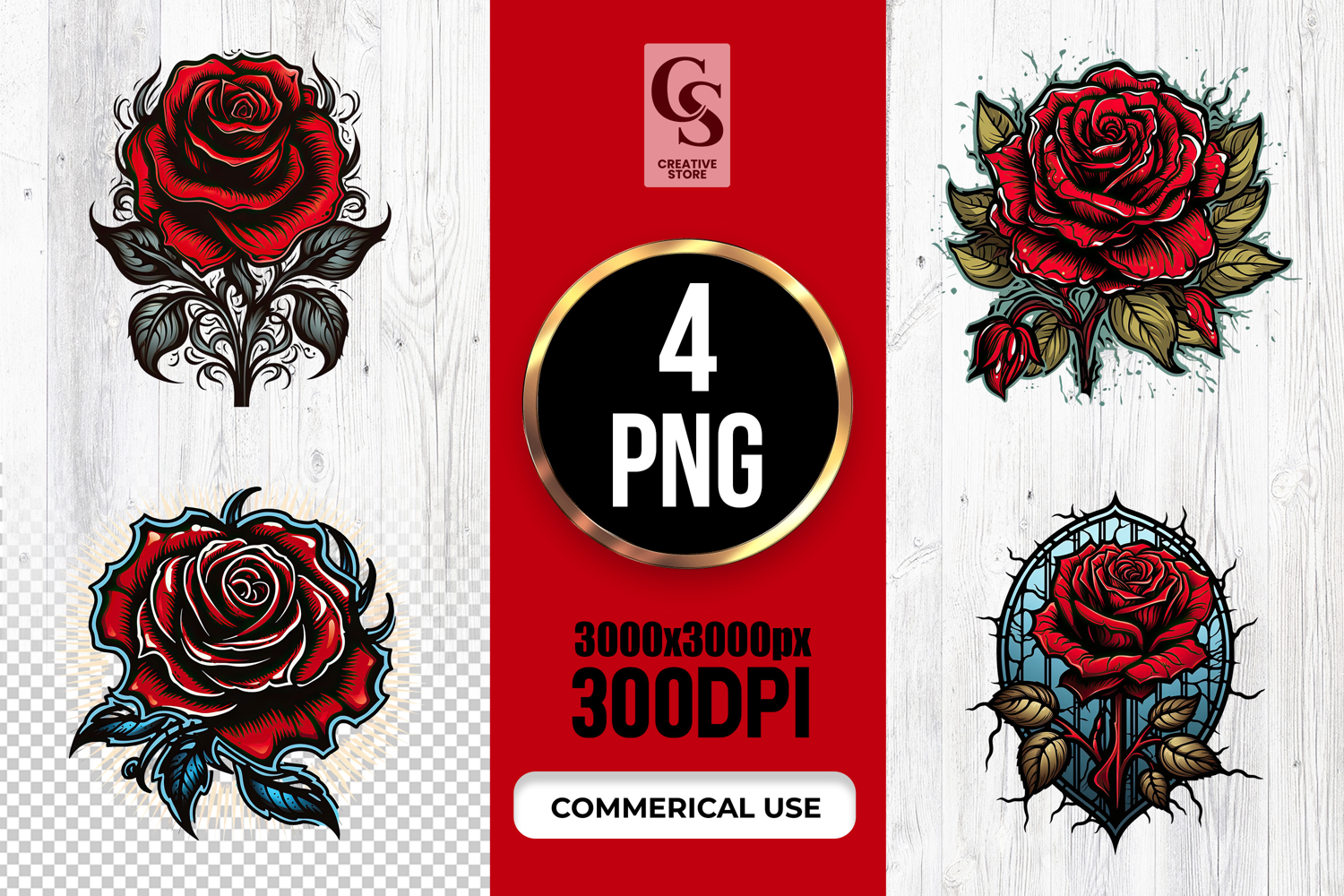 4 Vintage Red Rose Tattoo Style Clipart Sublimation PNG Files Perfect for Greeting Cards, Invitations, Junk Journal, Party Decor, Scrapbooking and many other craft projects.