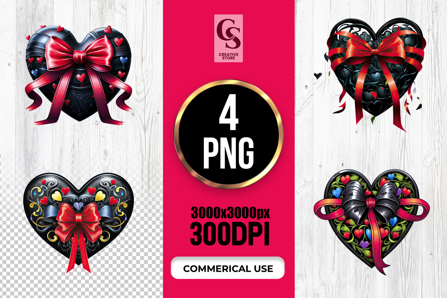 4 Black Heart With Red Ribbon Clipart Sublimation PNG Files Perfect for Greeting Cards, Invitations, Junk Journal, Party Decor, Scrapbooking and many other craft projects.