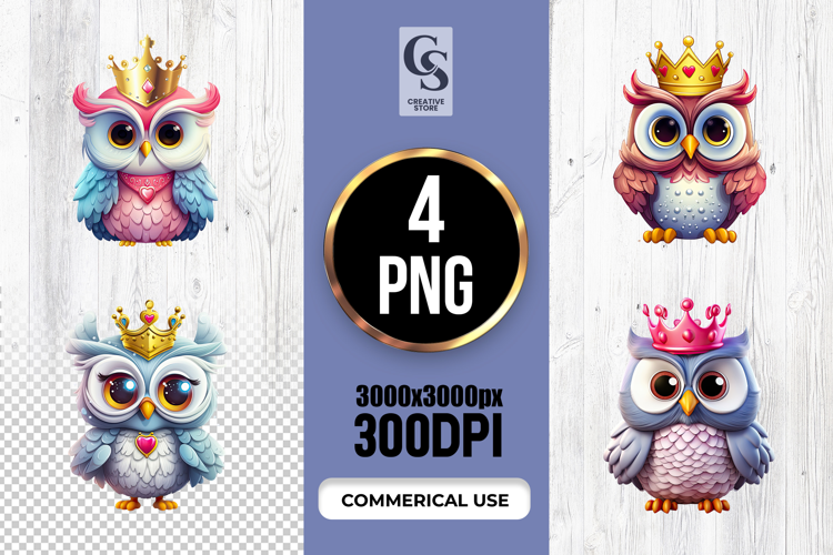 4 Cute Kawaii Crown Owl Clipart Princess Bird PNG Files Perfect for Greeting Cards, Invitations, Junk Journal, Party Decor, Scrapbooking and many other craft projects.
