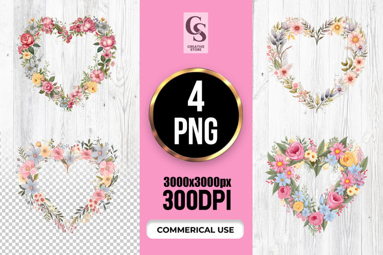 4 Floral Heart Wreath Illustration Clipart Sublimation PNG Files Perfect for Greeting Cards, Invitations, Junk Journal, Party Decor, Scrapbooking and many other craft projects.