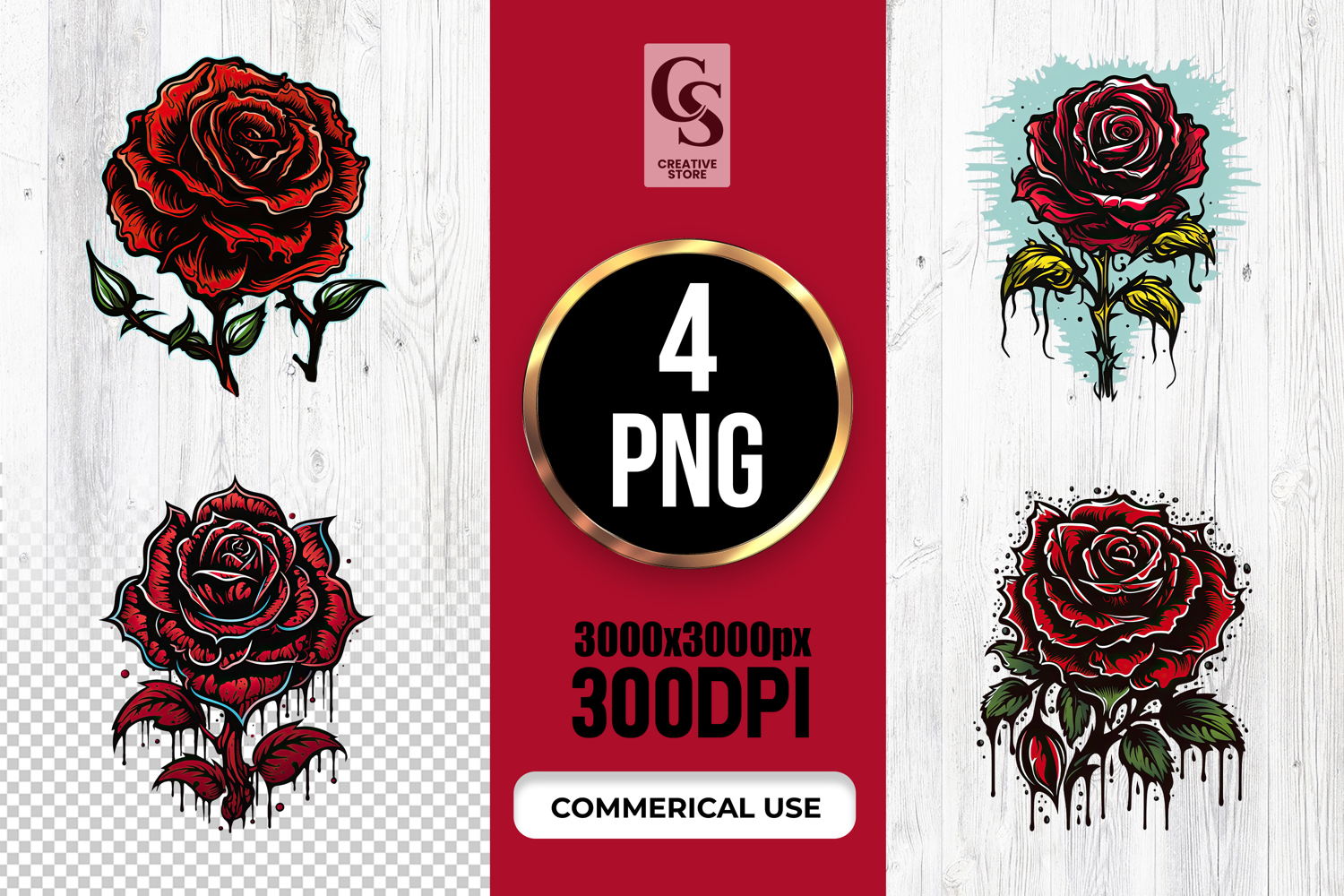 4 Dark Red Rose Illustration Clipart Sublimation PNG Files Perfect for Greeting Cards, Invitations, Junk Journal, Party Decor, Scrapbooking and many other craft projects.