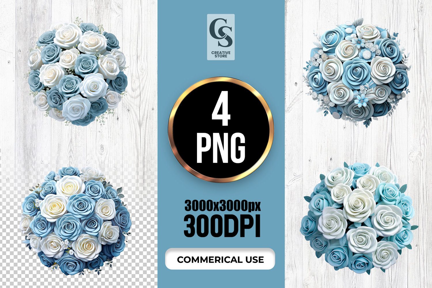 4 Teal and White Rose Flower Ball Clipart Sublimation PNG Files Perfect for Greeting Cards, Invitations, Junk Journal, Party Decor, Scrapbooking and many other craft projects.