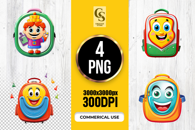 4 Cartoon School Backpack Character Clipart Sublimation PNG Files Perfect for Greeting Cards, Invitations, Junk Journal, Party Decor, Scrapbooking and many other craft projects.