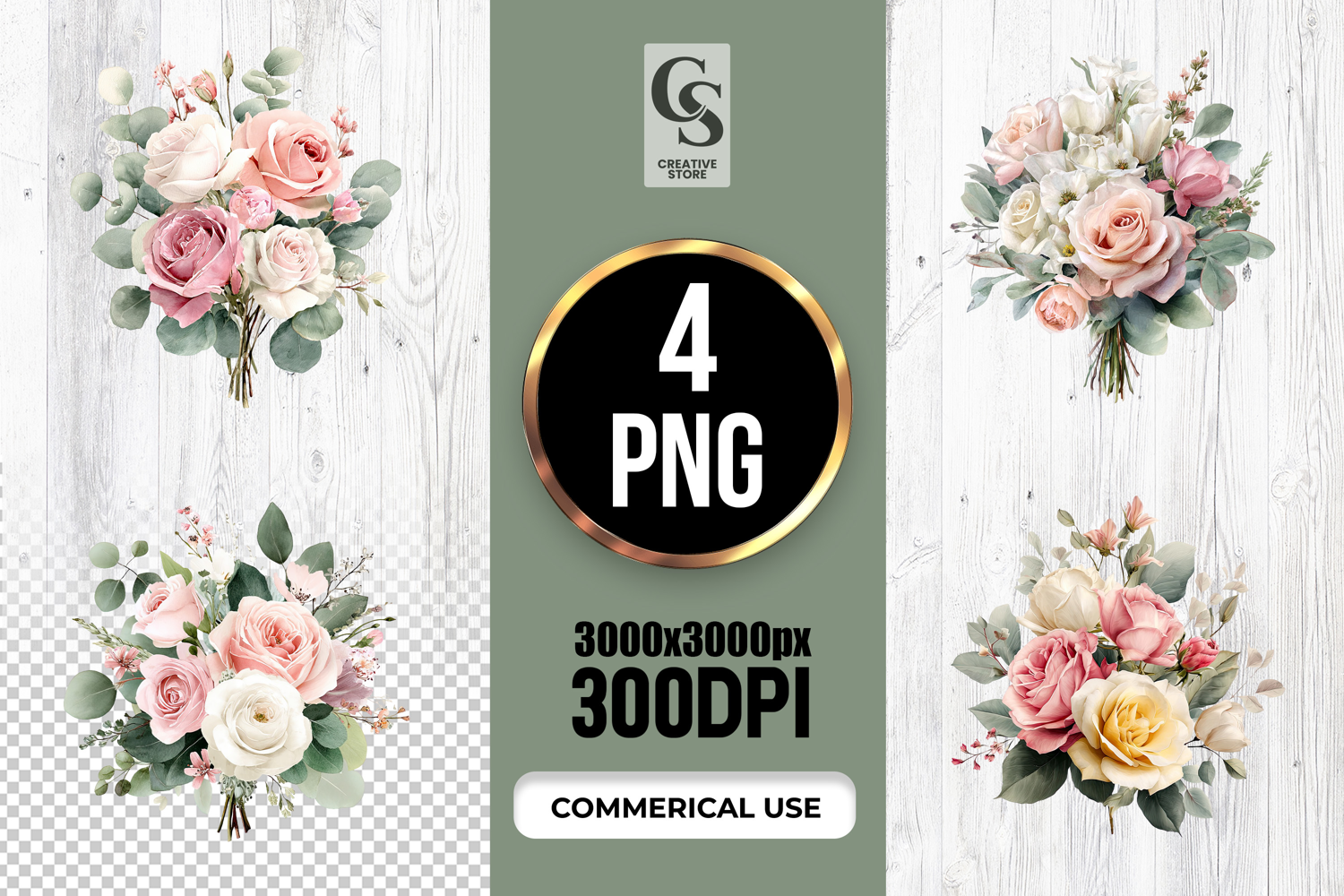 4 Watercolor Rose Bouquet Floral Clipart Sublimation PNG Files Perfect for Greeting Cards, Invitations, Junk Journal, Party Decor, Scrapbooking and many other craft projects.