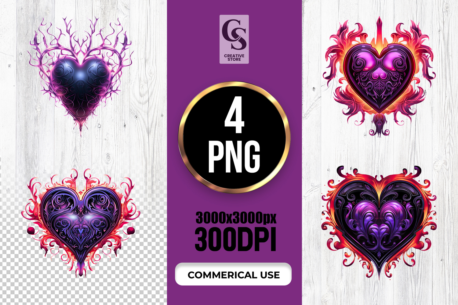 4 Gothic Purple Heart Illustration Clipart Sublimation PNG Files Perfect for Greeting Cards, Invitations, Junk Journal, Party Decor, Scrapbooking and many other craft projects.