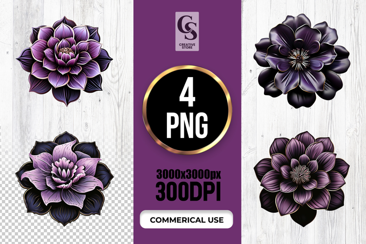 4 Elegant Purple Flower Illustration Clipart Sublimation PNG Files Perfect for Greeting Cards, Invitations, Junk Journal, Party Decor, Scrapbooking and many other craft projects.