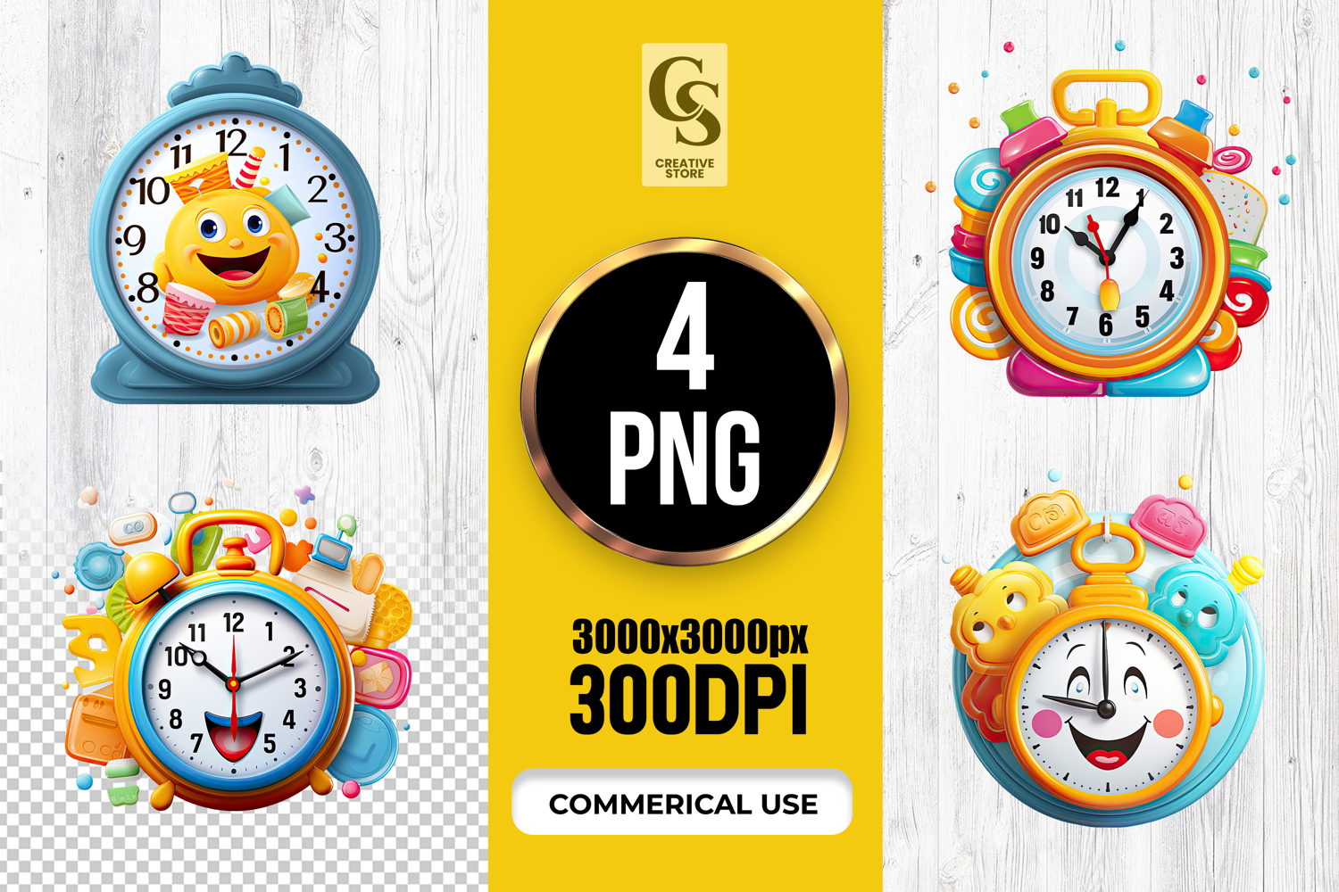 4 Cute Cartoon Alarm Clock Character Clipart Sublimation PNG Files Perfect for Greeting Cards, Invitations, Junk Journal, Party Decor, Scrapbooking and many other craft projects.