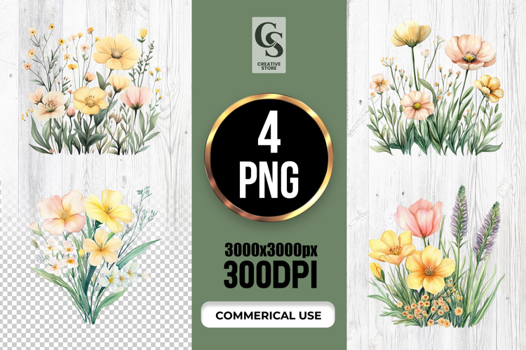 4 Watercolor Wildflower Floral Clipart Sublimation PNG  Files Perfect for Greeting Cards, Invitations, Junk Journal, Party Decor, Scrapbooking and many other craft projects.