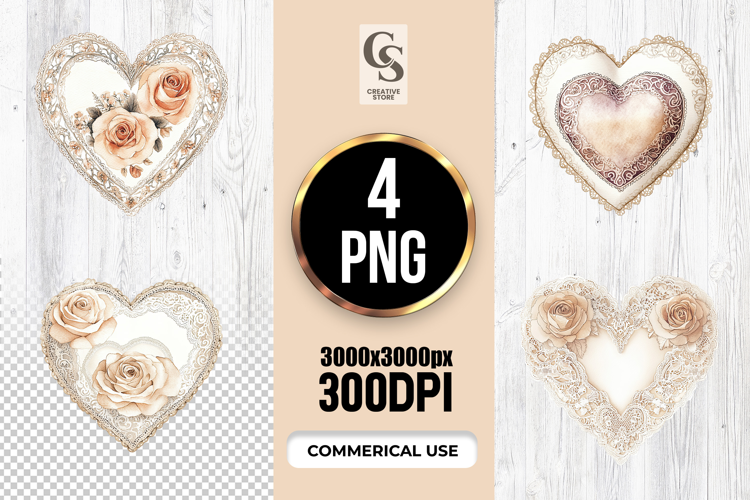 4 Vintage Lace Rose Heart Clipart Sublimation PNG  Files Perfect for Greeting Cards, Invitations, Junk Journal, Party Decor, Scrapbooking and many other craft projects.