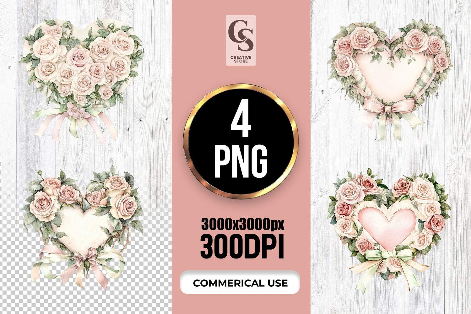4 Romantic Rose Heart Wreath Clipart Sublimation PNG Files Perfect for Greeting Cards, Invitations, Junk Journal, Party Decor, Scrapbooking and many other craft projects.