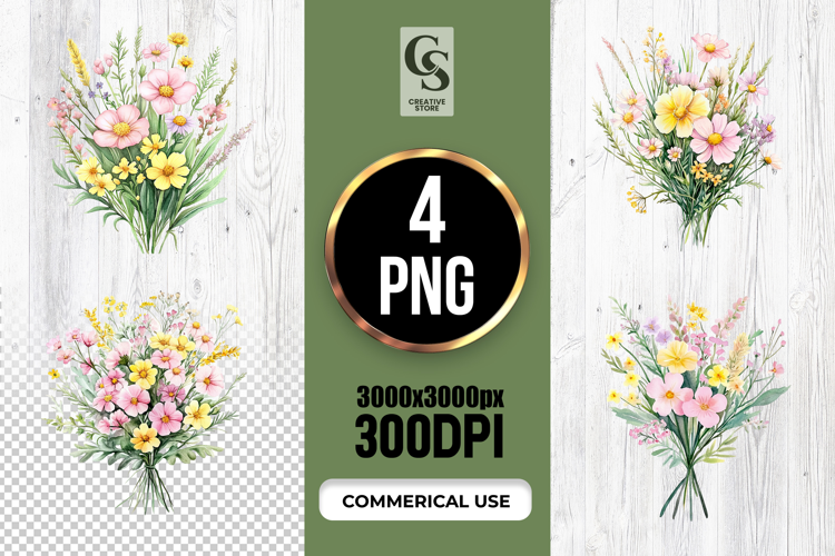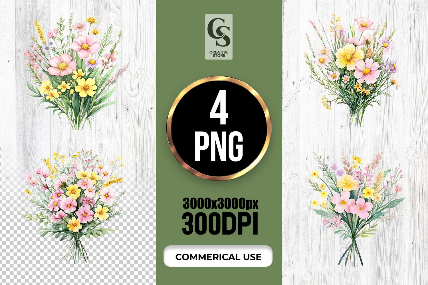 4 Watercolor Wildflower Bouquet Clipart Sublimation PNG Files Perfect for Greeting Cards, Invitations, Junk Journal, Party Decor, Scrapbooking and many other craft projects.