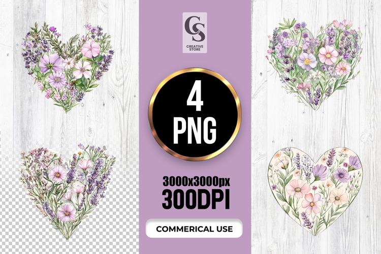 4 Watercolor Lavender Floral Heart Clipart Sublimation PNG Files Perfect for Greeting Cards, Invitations, Junk Journal, Party Decor, Scrapbooking and many other craft projects.