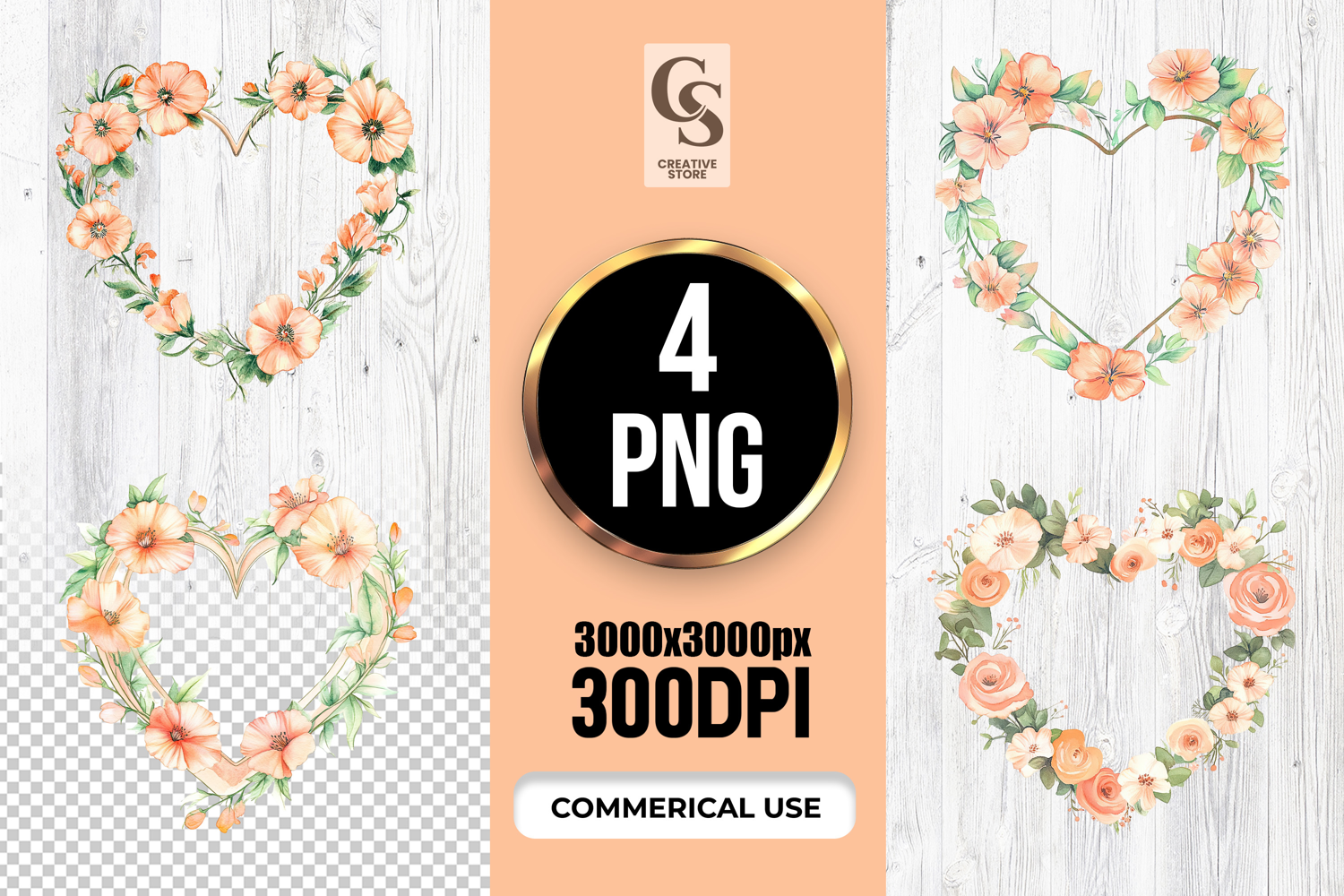 4 Watercolor Peach Floral Heart Clipart Sublimation PNG Files Perfect for Greeting Cards, Invitations, Junk Journal, Party Decor, Scrapbooking and many other craft projects.