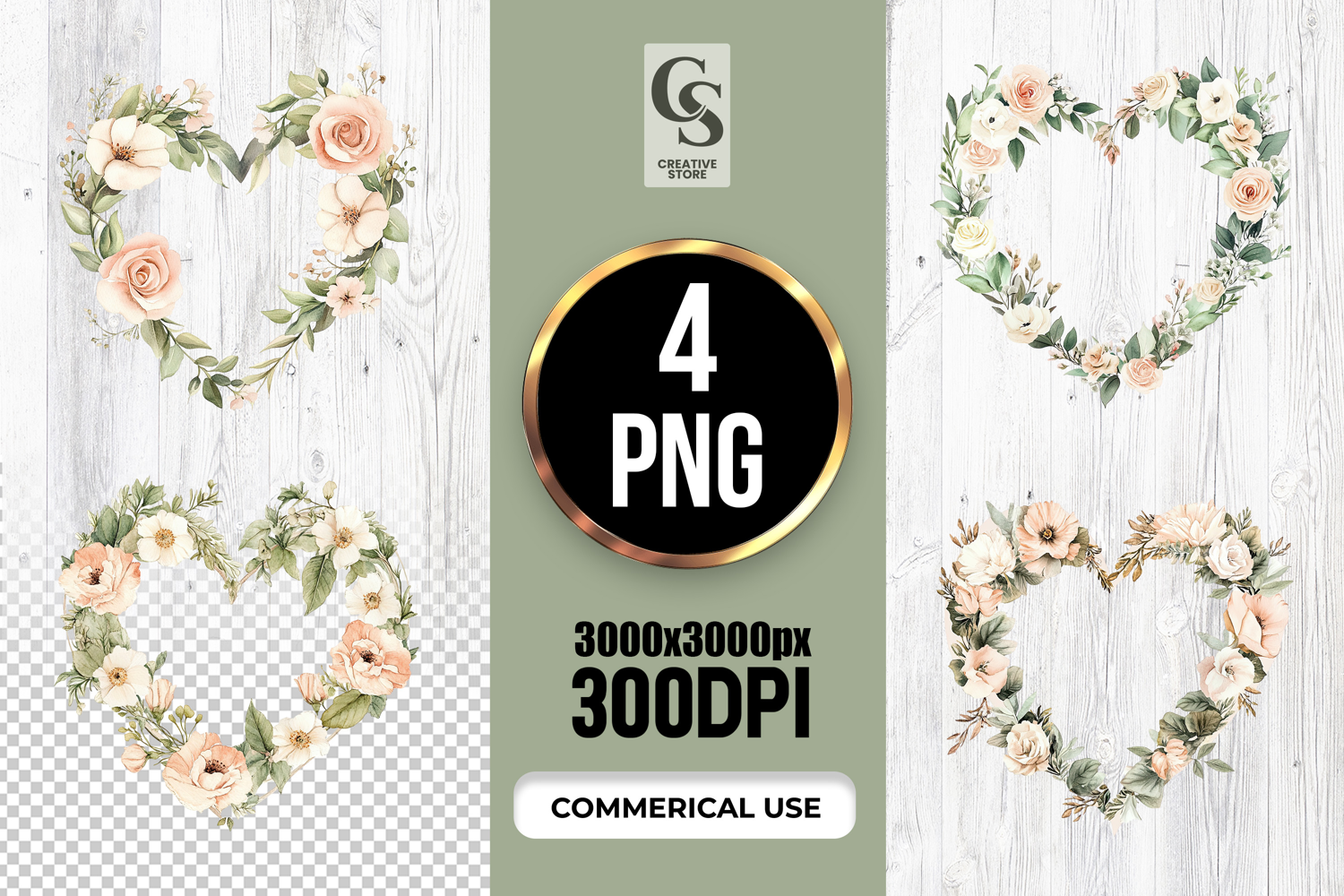 4 Watercolor Floral Heart Wreath Clipart Sublimation PNG Files Perfect for Greeting Cards, Invitations, Junk Journal, Party Decor, Scrapbooking and many other craft projects.