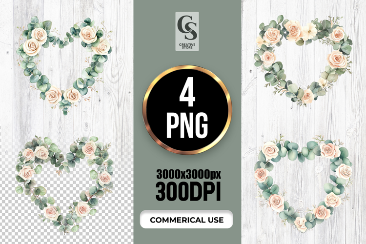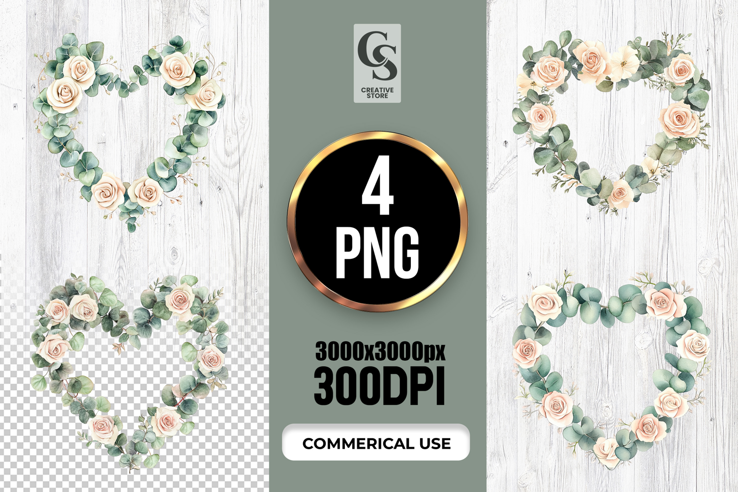 4 Eucalyptus Floral Heart Wreath Clipart Sublimation PNG Files Perfect for Greeting Cards, Invitations, Junk Journal, Party Decor, Scrapbooking and many other craft projects.