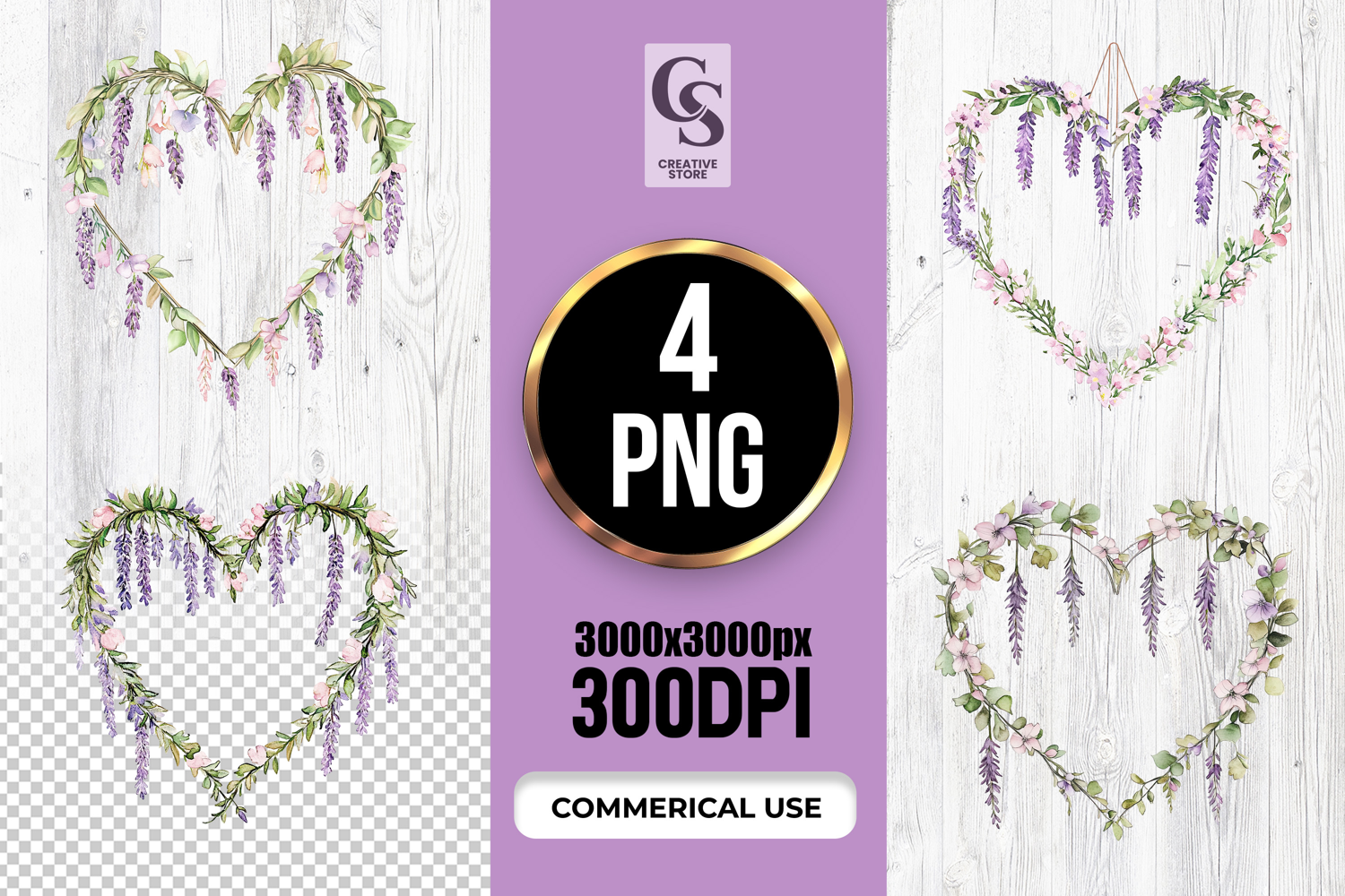 4 Watercolor Wisteria Heart Floral Frame Clipart PNG Files Perfect for Greeting Cards, Invitations, Junk Journal, Party Decor, Scrapbooking and many other craft projects.